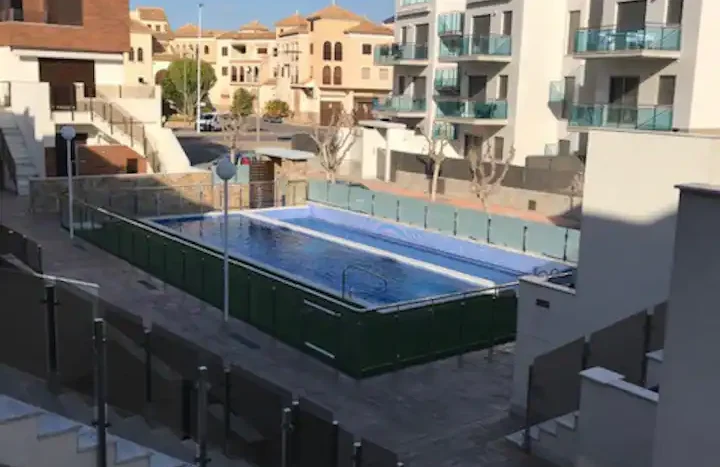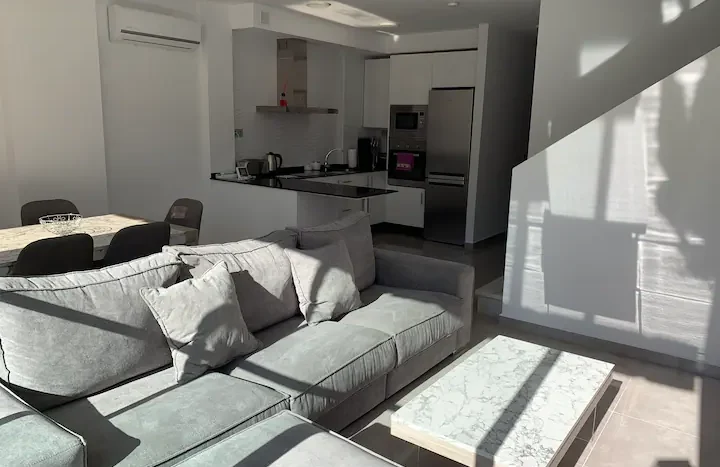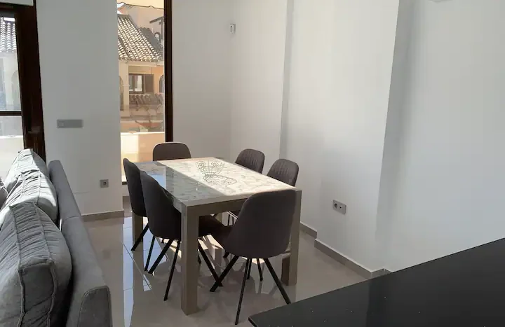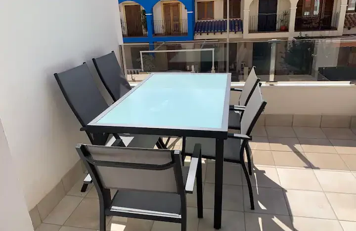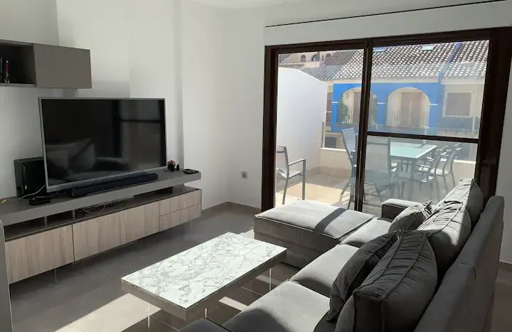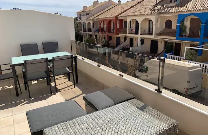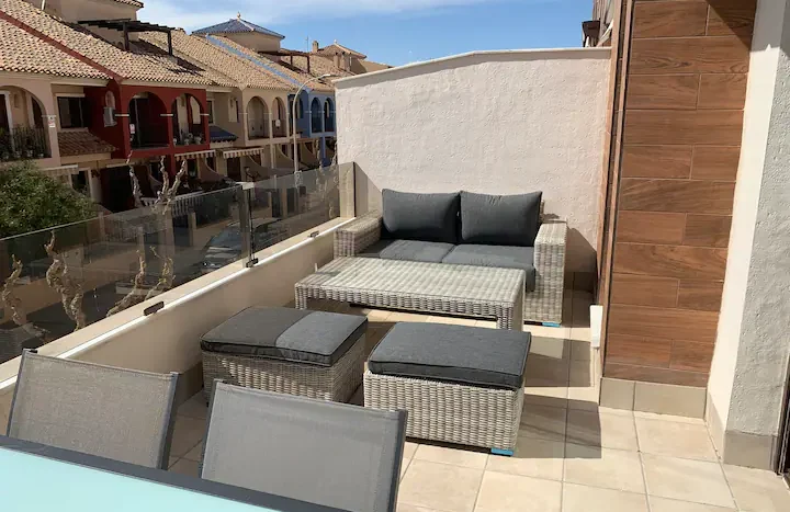 This luxury 3 bedroom penthouse apartment was built in 2018. The property has 3 bedrooms, 2 bathrooms 3 balconies and a stunning roof top terrace with views of the Mar Menor. There is also a communal pool with a grassed area for sunbathing. The apartment has all the mod cons – air con, wifi, english TV and a fully fitted alarm system.The property is located 30 metres from the beach and 40 metres to the centre of Los Alcazares where you will find numerous bars, shops and restaurants. Murcia International Airport (Corvera) is a 25 minute drive and Alicante airport is around 55 minute drive from the apartment.